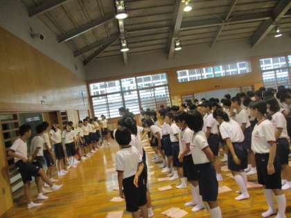 9月3日 群団応援練習スタート 公開日 2015/09/04 更新日 2015/09/04 お知らせ 今日から体育祭の群団応援合戦に向けた練習が始まりました。3年生がハツラツとした姿勢で、1,2年生をリードする姿はとても頼もしく感じました。それに応えるように1,2年生も身振り手振りで必死についていくようすも印象的でした。練習を通して、群団の絆をさらに深め、本番では全員が納得のいく演技ができるよう応援しています。