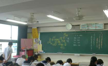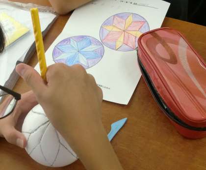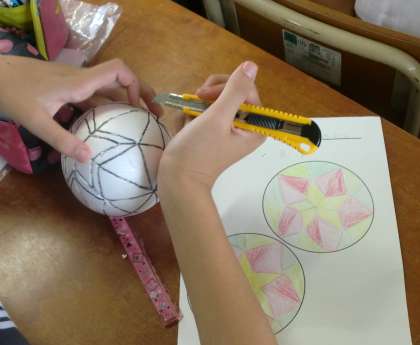 2年生の美術では、伝統工芸の「木目込み毬」を作っています。木を彫るのは難しいので、発泡スチロールのボールに自分で絵をデザインし、そのふちに切れ目を入れます。この切れ目に布を押し込み、糸で飾ると出来上がるようです。まだ作り始めたばかりで、色はついていませんが、どこまで計画通りに進むのでしょうか。出来上がりが楽しみです。