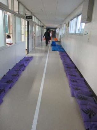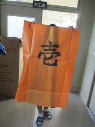 今日は体育祭の練習にとっては残念な雨でしたが、1年生は午後からの2時間を使って住吉踊り用ハッピの仕上げを行いました。群団色のハッピの背中に学級がわかるように黒スプレーで、壱,弐,参,,,と書き込みました。