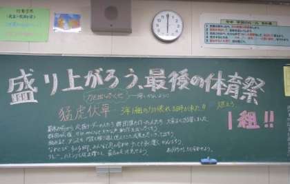 天候にも恵まれ,今日は待ちに待った体育祭です。気合いが入っているのは,生徒だけではありません。各教室には,担任の先生からの熱い思いが黒板いっぱいに書かれています。さあ,今まで練習してきたことをすべて出し切り,仲間とともにすてきな1日にしましょう!