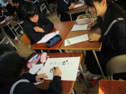 学校訪問のこの日、2年4組では社会科の研究授業が行われました。地理の学習で、近畿地方を紹介するためのキャッチコピーを考える授業でした。一人一人がキャッチコピーを考え、それをグループで紹介しながら意見をまとめ、発表し合いました。級友の意見を聞いて活発に意見を交わす場面も見られ、盛り上がりました。これから学習する単元でも、特色をとらえたキャッチコピーが考えられるといいですね。