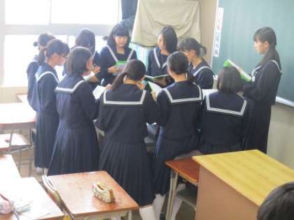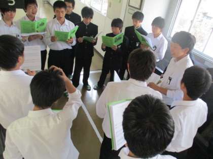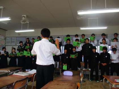 11月9日(月)に行われる合唱コンクール。以前から音楽の授業でコツコツ教わってきましたが,昨日から朝や昼休みの少しの時間も練習できるようになりました。今日は,2年生が校外学習で学校にいませんでしたが,1年生の元気のよい歌声や3年生の美しいハーモニーが学校に響きました。今は楽譜を見て,パート練習で音程を確かめながらの練習ですが,「昨日よりも今日!今日より明日!」という気持ちで頑張っています。3年生にとっては,最後の合唱コンクールです。「全力合唱」で悔いなくやり切ってほしいと思います。