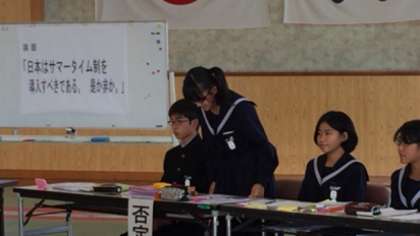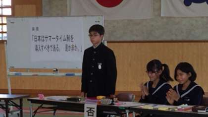 10月24日 一宮市ディベート大会1 公開日 2015/10/24 更新日 2015/10/24 お知らせ 本日は奥中学校にて一宮市ディベート大会が行われています。議題は「日本はサマータイムを導入するべきである。是か非か。」です。今伊勢中の選手のみなさんは午後からの試合となっており、先ほど第一試合が始まりました。相手は北方中です。これまでたくさんの時間をかけて練ってきた立論に自信をもって、堂々と意見や考えを述べています。
