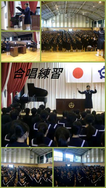 次に、初めて全校合唱曲「地球星歌」を全員で歌いました。今日はそのために、各学年合唱隊形で屋内運動場に入場しており、指揮者の号令のもと歌を歌いました。初めてのこともあり、800人からの合唱にしては物足りないと感じるところがあったのは残念です。残り2週間での修正を期待したいところです。♪この青空は続いている♪
