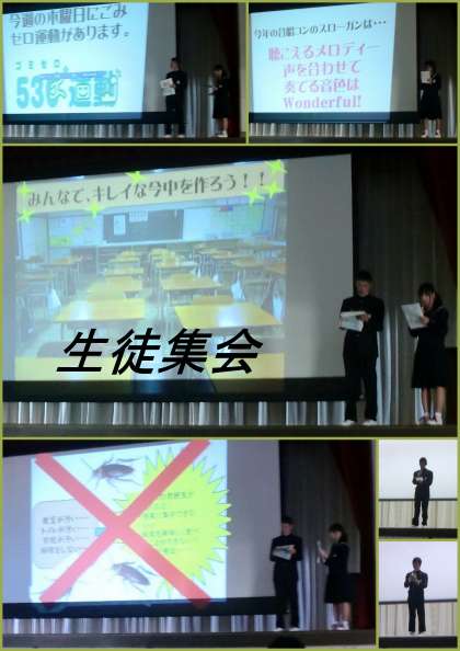 その後、コンクールスローガン発表に続き、掃除に対する取り組みの是非を全校生徒に問いかける取り組みも行われました。美しい環境を守ることの大切さが、力強く訴えられたと思います。