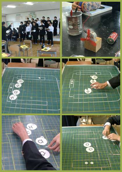 3年生の電気分解の実験のまとめの様子です。今日は、どうして電気分解ができるのかを、モデルを使って班員に伝える授業でした。電子のやり取りで、イオンが原子になったり、電流がながれた形になったりすることを、一生懸命に説明している姿が印象的でした。