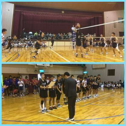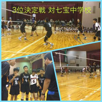 三位決定戦が行われ,七宝中学校と対戦しました。1セット目は相手スパイカーの高さにブロックが追いつかず,点差が開いてしまいました。2セット目は終盤までシーソーゲームとなりましたが,最期にじわじわと離されてしまいました。結果は0対2で惜敗。悔しさが残ります。本大会は4位となり,11月14日に開かれる県大会に出場します。県大会に向けて,より一層練習に励みましょう。