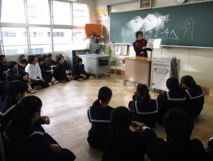 絵本を囲んで円を作り、終始真剣に絵本を見つめる生徒たち。