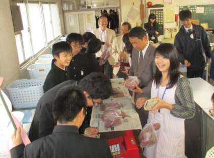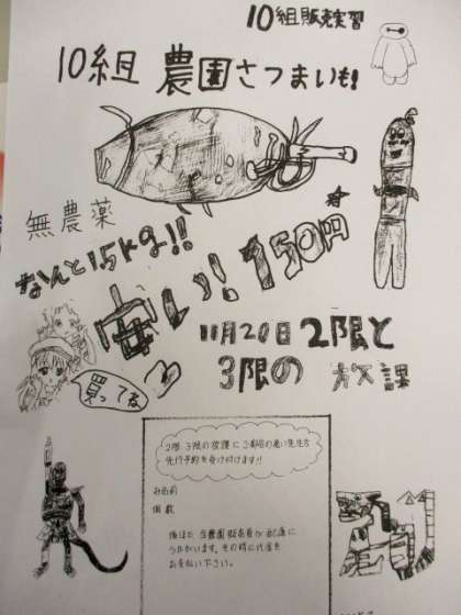 10組が先日収穫したさつまいもの販売実習を行いました。日時や『1.5kg150円』という値段の書かれたチラシを手作りして事前に配り,いつもお世話になっている先生方へ販売しました。「いらっしゃいませ♪」という元気な呼び込みや,「200円のお預かりだから50円のお釣りです!」と計算もしっかり行い,あっという間に完売しました。今回の売上金で次は大根の種を買い,立派に育てます。次の大根の販売実習が楽しみです。