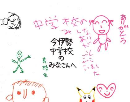 今日はかしの木の皆さんが書いた色紙をお礼にといただきました。決して上手な絵ではないかもしれませんが、温かさいっぱいの色紙です。書いてくださった皆さんの気持ちがうれしく、皆さんにぜひ紹介したくなりましたのでホームページにアップしました。(一部個人名が記載されていたので、画像を処理しています。)