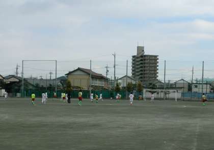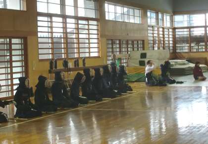 運動場では、サッカーの大会が開かれています。本日は3つの学校が集まり、リーグ戦を行うことになっています。ブラスバンド部は室内、テニスコートではテニス部が活動をしています。高校生のOBが来てくれ、剣道の指導にあたってくれました。