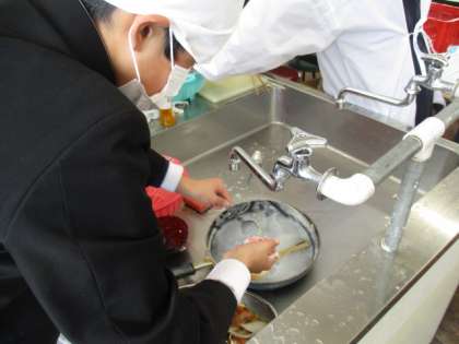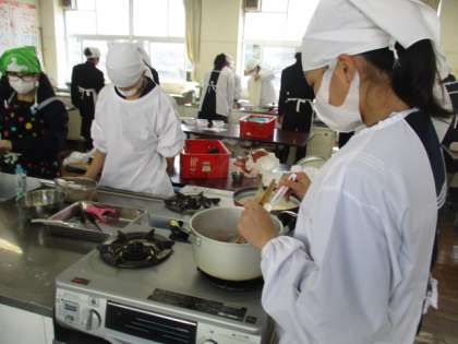 3月17日 1年生調理実習 公開日 2016/03/17 更新日 2016/03/17 お知らせ 家庭科の調理実習で、クリームシチューとフルーツ白玉を作っています。 テーブルごとに役割分担を決め、協力して作業にとりくんでいます。 使った食器や調理器具を丁寧に洗う姿も見られました。 おいしくできるといいですね。