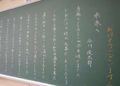 4月8日 新年度2日目 朝の教室 公開日 2016/04/08 更新日 2016/04/08 学校生活 新しい学年,新しいクラス,新しい担任の先生との生活が始まりました。2日目のスタートです。生徒の皆さんはもちろんのこと,担任の先生方もこれからの1年を楽しみにしています。朝の教室の黒板には,生徒の皆さんに向けて担任の先生から、温かいメッセージがたくさん書かれていました。