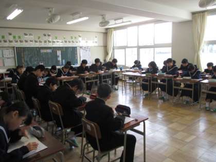 4月19日 初めての道徳 公開日 2016/04/20 更新日 2016/04/20 お知らせ 1年生にとって、中学校で行う初めての道徳がありました。席の配置もいつもと違い、どことなく緊張しているようでした。