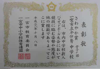バスケットボール部 女子の「さわやか賞」に今伊勢中学校が選出されたということです。前回の集会で,校長先生・生徒指導主事の先生からあいさつの話がありました。そんななか,大会会場でのあいさつやマナーのよさを評価していただけたことはうれしいことです。