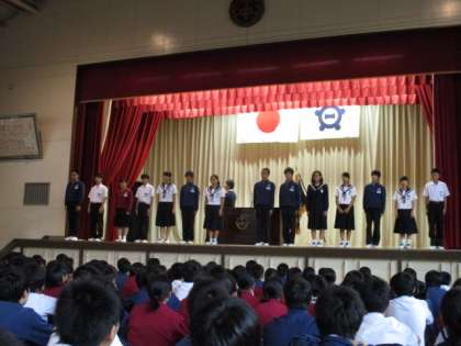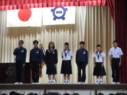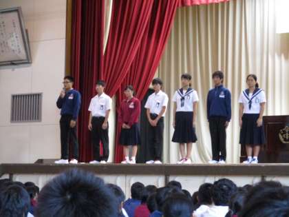 任命式のあと、生徒会の新旧引継ぎの会がありました。前期の生徒会メンバーがそれぞれの思いを語り、後期の生徒会メンバーが彼らの思いを引継ぎ、生徒会活動に取り組むという意気込みを語ってくれました。後期には、合唱コンクール、3年生を送る会、卒業式と大きな学校行事があります。前期の生徒会と同様に活躍してくれることを期待しています。