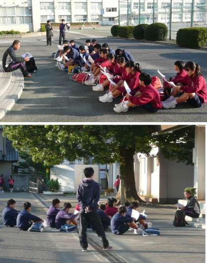 今日は大会です。早朝から,駅伝部の生徒が集合し,各ポイントに立ってタイムを知らせる係などの打ち合わせを行っています。監督の先生からは,「全員で勝ちにいきましょう」という言葉がありました。