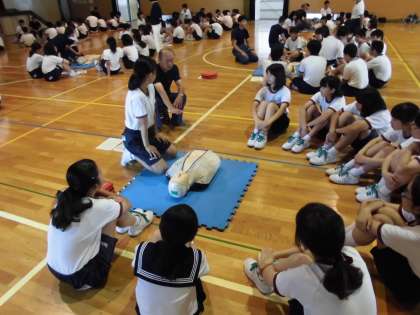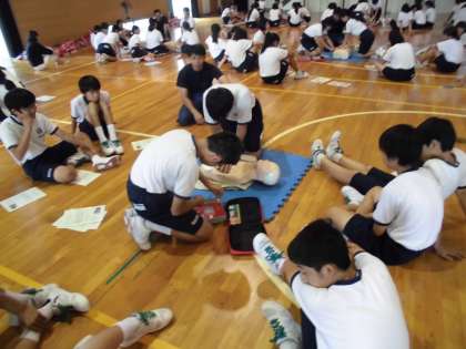 2年生の前半クラスと後半クラスが,午前・午後に分かれて,救急救命講習を受けました。10人ほどの班ごとに分かれ,消防署隊員の方々から,心臓マッサージ・人工呼吸・AEDの使い方を学び,人形を相手に実際に練習をしました。緊張しながらも,真剣に学ぶことができました。