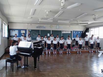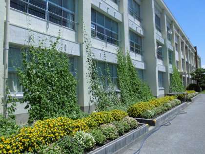 7月26日 合唱部の活動・緑のカーテン 公開日 2017/07/26 更新日 2017/07/26 部活動 合唱部は7月30日のサマーコンサート、8月1日のNHK合唱コンクールに向けて、課題曲や自由曲、ジブリの曲の練習をしています。ハーモニーの確認や、指揮者・伴奏者との合わせを繰り返し、より良い合唱にしようと頑張っています。 また、北館・南館の南側花壇では、緑のカーテンを設置しようと、アサガオ・ゴーヤを育てています。1階部分を覆い始めており、カーテンの裏には大きなゴーヤができていました。