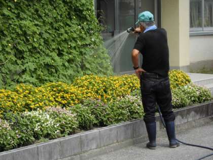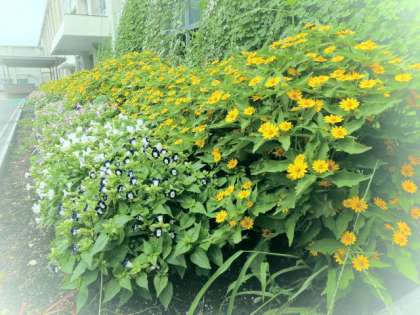 北館の前に花だんが設置されています。夏になって花々がグングンと成長してきました。日頃から休日は、「休日学校管理業務」を委託されたお年寄りの方が来校され、花の水やりをしてくださいます。いろいろな人に支えられて、学校は成り立っているのです。ありがとうございます。