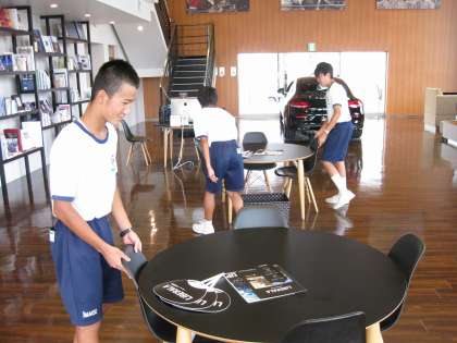 自動車販売店の様子です。開店準備のために,店内の清掃をしたり,店舗の周囲に立てるのぼり旗を立てたりする仕事を行いました。また,主にベンツやBMWといった高級車を取り扱う店舗のため,そういった高級車も洗車させていただくことができました。自動車に傷をつけないように,真剣に作業の手順を聞いていました。