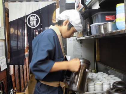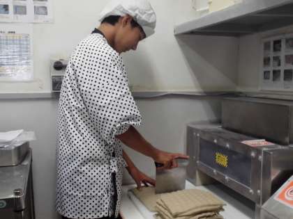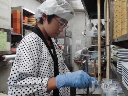 こちらの店舗では,お客様に提供するお茶の準備や茶碗蒸しの下準備をさせていただきました。制服姿もなかなか決まっています。