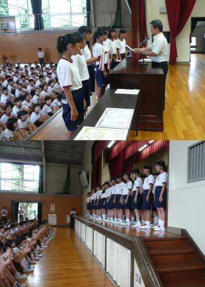 8月4日 全校出日 公開日 2017/08/04 更新日 2017/08/04 学校生活 エアコン工事で教室が使えないなかでの全校出校日となりました。体育館では、西尾張大会・県大会の表彰伝達を行いました。