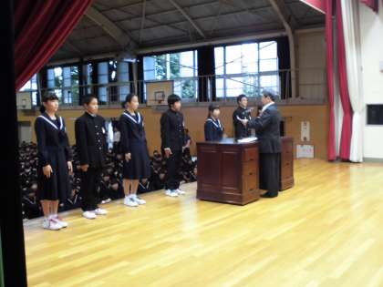 本日の6限目に後期役員任命式が行われました。まずは生徒会執行部の生徒たちが任命されました。次に、各委員会の委員長、室長、代議員、書記が任命されました。その後、旧執行部を代表して前期の生徒会のあいさつがあり、新生徒会会長の着任のあいさつをしました。とても厳粛な雰囲気で行われ、後期の良いスタートが切れたと思います。みんなでより良い今伊勢中学校を築いていってほしいです。