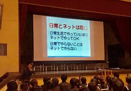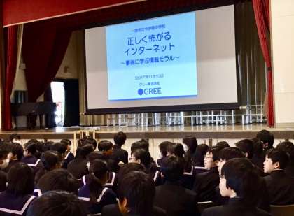 GREE株式会社の方を講師に招き,2年生を対象に『正しく怖がるインターネット〜事例に学ぶ情報モラル〜』と題して情報モラル講座を行いました。講演では,インターネットを安全かつ楽しく利用するための,正しいルールや注意点について,以下のポイントで分かりやすく説明していただきました。