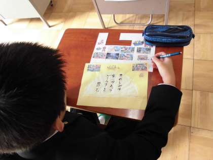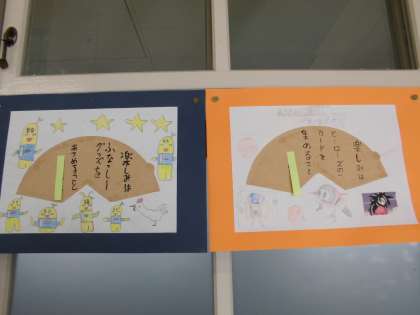 コーヒーフィルターに筆ペンで五・七・五を書きました。またその作品を表す絵を描きまし。扇のような作品が出来上がりました。皆一生懸命です。