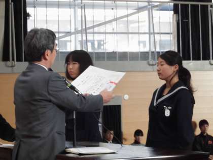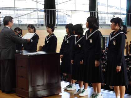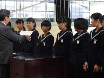 運動,文化の両面で今中生は頑張っています。今朝は,全生徒が体育館に集まって,表彰伝達式が行われました。今日の表彰は,ソフトテニス男女,ハンドボール女子,卓球男女の運動部,そして,文化面であるポスターや書道など,たくさんの生徒が舞台に上がって,表彰を受けました。