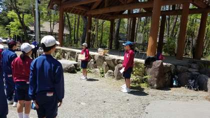 管理責任者の洞平さんからお話を聞きました。今伊勢中学校はこのひるがの高原キャンプ場にお世話になりはじめて40年になるそうです。お父さんお母さんもここで自然教室を体験したという人もいるかもしれません。しっかり楽しんで、おうちに帰ってからいろいろな話をしてほしいですと言っていただきました。