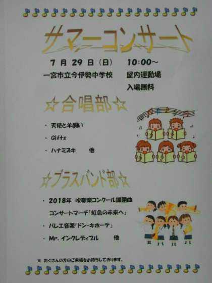 台風の影響が心配されましたが、暴風警報が解除されましたので、本日、サマーコンサートを開催します。一生懸命に演奏しますので、ぜひお越しいただき、楽しんでいただけたらと思います。たくさんの方のご来場をお待ちしております。