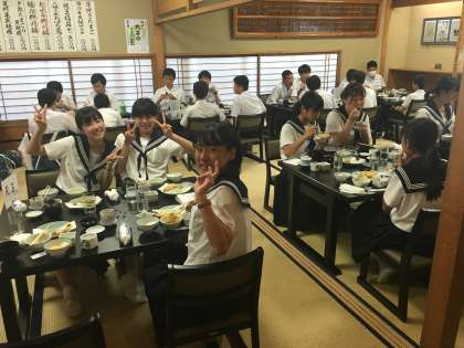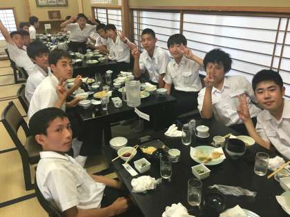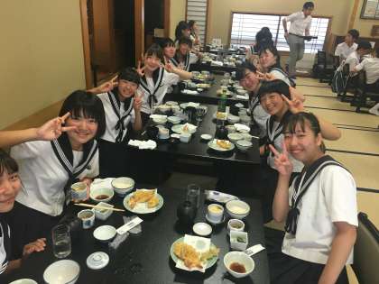 4組の夕ご飯の様子です。おいしい天ぷらにみな笑顔です!