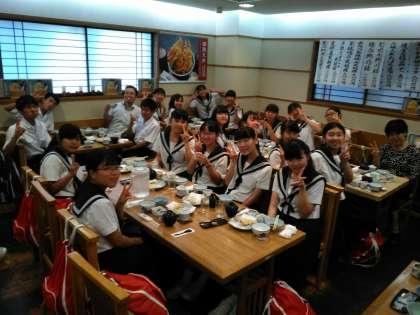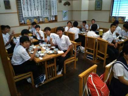 1組の夕食風景です。 みんな天ぷら美味しそうです。