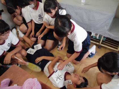 各部活動に分かれて、部活動中に熱中症で倒れた生徒が出たことを想定したシミュレーションを行いました。職員室や保健室の先生を呼びに行く人、体をうちわなどで冷やす人などどんな役割がいるかを考えてました。こうした訓練では、いざというときに使えるようになることが大切です。今日学んだことをしっかり身につけて、これから暑くなる時期の部活動に備えていきましょう。