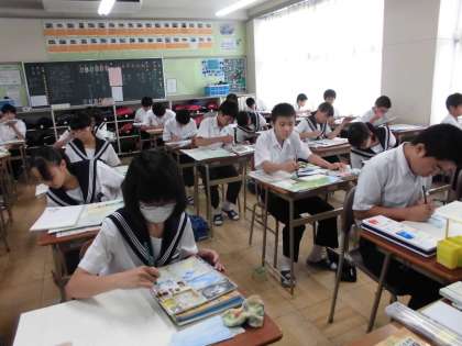 2年生の美術では、写生の色塗りをしています。水彩絵の具の特性を生かしながら、近景と暗色を上手に描きこんでいます。
