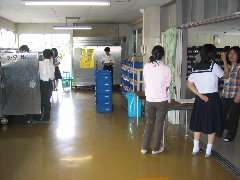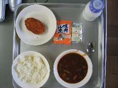 今日の給食は、ハヤシライスとエビカツ(タルタルソース)と小魚、牛乳です。生徒の皆さんには割りと好評な献立のひとつです。