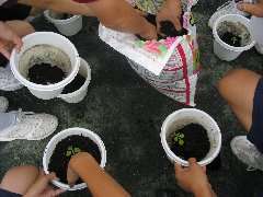 全学級が一斉に運動場へ出て、それぞれの学級単位で写真のようにして植え替えました。この植木鉢は、終業式の日に自宅へ持ち帰り、夏休みの間各家庭で育てられます。全校生徒が愛情をこめて育てたサルビアは、体育祭のときに学校を真っ赤に飾ってくれます。