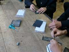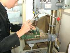 2年生の技術の時間は、金属加工を行っています。今年はオリジナルキーホルダーを作ります。まずは自分のデザインした形に、金鋸で切り出します。次はボール盤を使っての穴あけです。初めて使う機械に、みな緊張の面持ちです。切口や穴の周りをやすりで削り、形を整え、オリジナルキーホルダーの出来上がりです。初めての金属加工、形が出来上がるにつれ、笑顔が増えてきます。