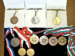 屋内運動場には、オリンピックの金銀銅メダルや、世界選手権の金メダルが飾られ、実物投影機で壁面に大きく映し出されました。
