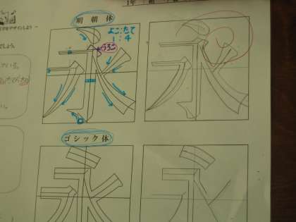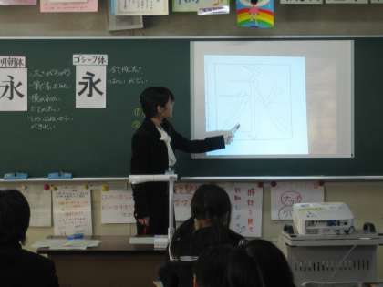 今日は、1時間目に1年1組で美術の研究授業が、3時間目に1年3組で英語の研究授業が行われました。美術の授業は、「文字を生かしたデザイン」−文字をレタリングしようーという題材で、「永」という文字を明朝体とゴシック体で表現できるように授業が行われました。また、英語の授業は、「現在進行形」の形、意味、用法の理解を中心に、ペア学習を取り入れながら行われました。どちらもICT機器を利用して授業が行われ、生徒たちも一生懸命に学習に励んでいました。