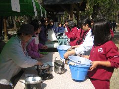 最終日の様子です。3種類のパンは、どれもがおいしかったようです。朝からコロッケパンを食べることは少々きついと私は思うのですが、聞くところによるとみんなぺろりと食べられるんだそうです。空気がおいしいからでしょうか。また、普段は牛乳が飲めない生徒さんでも、山では飲めることもあるそうです。