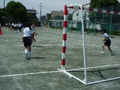 そんな貴重な晴れ間の体育の授業風景です。ハンドボールを行っています。2人1組でボールをパスしあっているところです。