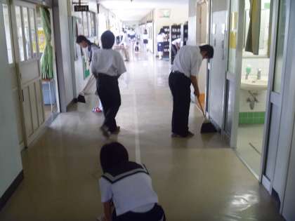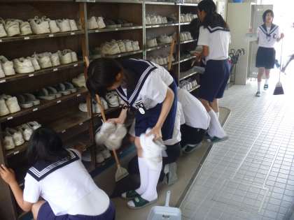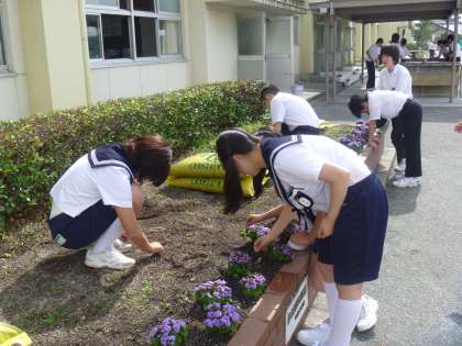 生徒のみなさんは10分間しかない朝の清掃活動に一生懸命に取り組んでいます。いつも美しい環境が保てるように教室、廊下、下駄箱、トイレなどを美しくしています。また、花壇では、夏の花を植える前の除草作業を行っています。これから美しい花が咲き誇り、心をなごましてくれることでしょう。