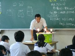 3つの電球を実際に教室でつけながら、電力や電力量の説明がなされていました。市販の100W60W40Wの電球です。写真を見て、明るさの違いが分かるでしょうか。正直な感想、あまり差がないように感じませんか?ということは、節電で40Wを使えば十分ということでしょうか?何か、不思議でした。