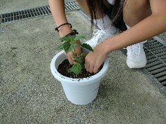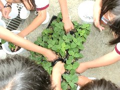 生徒会のメンバーが種から育てたサルビアが、ポットの中で大きく育ちました。昨年は、高温と大雨にやられ、この時期薄い黄緑色でしたが、今年のサルビアは、茎も太く、色も濃い緑色に育っています。一人ひとりが、自分の植木鉢を持ちそこで育てます。花を愛する心、自然を慈しむ心を育てたいですね。真っ赤なサルビアが学校を飾る日を楽しみにしています。
