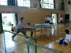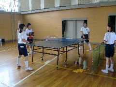 早いところは、来週から3年生最後の夏の大会が始まります。そのため、今日は最終調整をかねて、練習試合を行っている部活動がたくさんあります。外へ出る部が多いため、なんとなく運動場は閑散としており、今は、ソフト部が試合、ハンド部女子が練習という具合です。室内に目を向けると、卓球部が試合形式の練習をしていました。男子では、顧問のK先生が先陣を切って、3年生と戦ってみえました。軽快なフットワークに年齢を感じさせません。武道館では、ハンド部女子のレギュラー陣が室内練習をしていました。