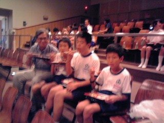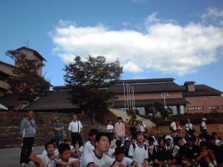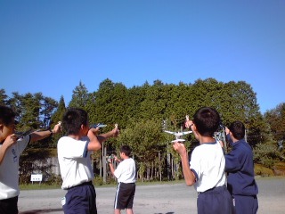10組の皆さんが、旭高原にキャンプに行っています。天候にも恵まれ、とても気分が良いようです。ここでは、まず体験学習として、ゴム動力飛行機を作りました。キャンプファイヤー場の広い広場に集まり、思い思いに自分の飛行機を飛ばしました。これからは、食堂で夕食を食べ、お風呂に入り、体育館でゲーム大会を行います。