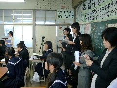 5限に、市内の英語科の先生方が集まられ、2年生のクラスで授業研究が行われました。今日の学習は、電話で相手を呼び出す表現でした。デジタル教科書を使って練習をした後、グループに分かれてロールプレイを行いました。その後、先生方だけで集まり授業の反省や、より良い授業の構築について話し合いがもたれています。